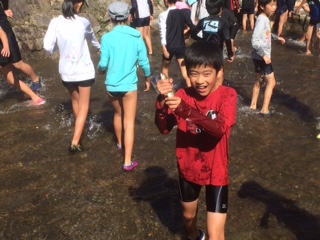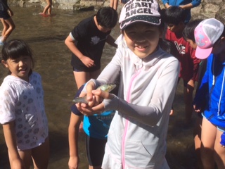 子どもたち全員で、鮎を追いかけ回し、1匹残らず捕まえました。川の水がどんどん減らされ、最後は鮎たちも逃げ場がなくなりました。気の毒な鮎たちです。まもなく塩焼きになります。