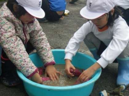 雨や台風の影響で延び延びになっていた1年生と2年生のサツマイモ掘りを、今日の午後、ようやく行うことができました。イモのつるや葉っぱは、すでに「野菜名人さん」によって取り除かれているので、あとはスコップを使いながら掘り出すだけでした。大きなサツマイモが次々に姿を現し、子どもたちは大喜びでした。