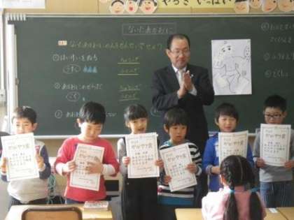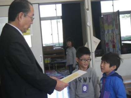 今日から11月です。今日は1年2組の教室で6人の子どもたちに「きらりかがやき賞」を渡しました。これは10月分のかがやき賞です。毎朝必ず全部の教室を回るようにしていますが、1年2組は全校で一番元気よくあいさつができる学級です。今日の表彰も元気いっぱいに返事ができました。11月もホームページ更新を頑張ります。10月は約7000件のアクセスがありました。いつも見ていただいて、ありがとうございます。明日はイボラン。楽しみにしています。