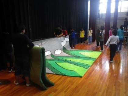 明日の校内学芸会のために、今日の午後は5年生と6年生が会場準備を行いました。明日は一度、本番と同じようにやってみて、最終的に微調整をし、土曜日の本番に最高の演技を見ていただけるようにします。学校だよりや学校メールなどでもお知らせしましたが、明日は給食があります。11日(土)の本番はお弁当が必要です。