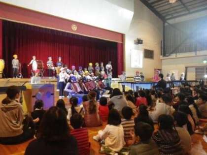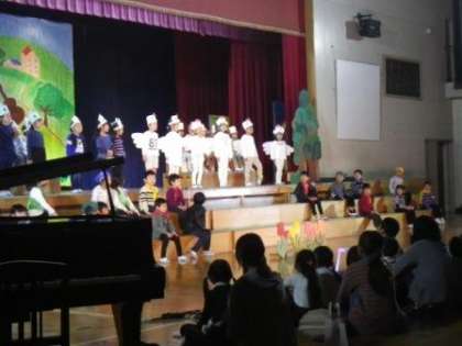 校内学芸会の午前の部が終了しました。子どもたちはよく頑張っています。1年生と5年生の演技の様子です。伊保こども園の園児も見てくれました。