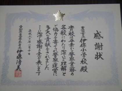 今日は1月10日。数字の並びから「110番の日」です。各地で警察に関するイベントが催されているようです。そのような日に、豊田警察署から警察業務に協力しているということで感謝状をいただきました。午前中に豊田市福祉センターで行われた式典で、市内の小中学校からは3校だけが感謝状を受けました。校長は別の会議に出席したため、教頭が代表して感謝状を受け取りました。
