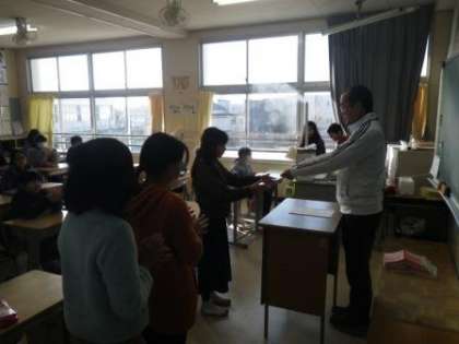 今朝は5年1組の教室で、1月分のきらりかがやき賞を渡しました。学級閉鎖の影響で1週間ほど渡すのが遅れましたが、7人の子に賞状を渡すことができました。今回は避難訓練の後、汚れた階段を掃除してくれた子や、図書室の本をたくさん読んだ子などが担任の先生から推薦されました。