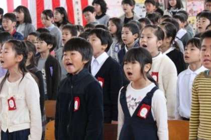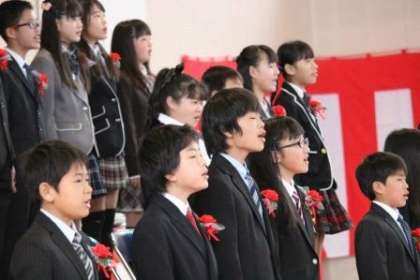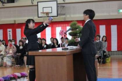 外は雨でしたが、体育館の中は春の光が差し込んでいるかのような、温かな雰囲気に包まれていました。写真は、PTAからの記念品贈呈と在校生送る言葉(歌)、卒業生別れのことば(歌)の様子です。