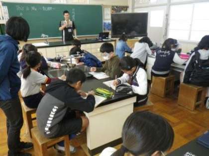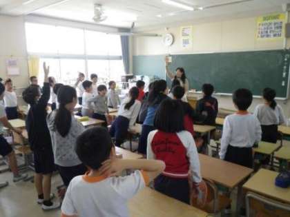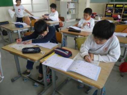 今年度から、3・4年生の外国語活動、5・6年生の外国語科の授業の先行実施を進めています。その関係で、授業時間数が増加しました。その増加分を、給食後の時間を活用し、15分間学習「SSタイム」を週3回行うことにしました。3・4年生は外国語活動を45分1コマに入れたため、国語・算数・総合の内容を15分間ずつに分けて行います。5・6年生は、新たに追加された外国語科1時間分を、15分ずつ3回に分けて「SSタイム」で行います。今日はその第1回目でした。1・2年生は従来通り、この時間を「読書タイム」として活用しています。
