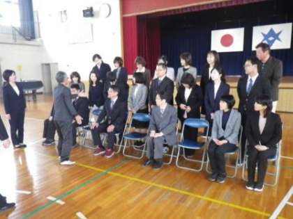 年度初めの恒例になっている学級写真撮影を、今日から始めました。欠席者のいない学級から順に撮影しています。1年生は入学式の時に、保護者の方も入っていただいて撮影したので、今回は撮りません。できあがりましたら、ご希望の方に業者を通して販売します。改めてご連絡します。職員も卒業アルバム用に集合写真を撮りました。撮影前の場所決めの様子を撮影しました。