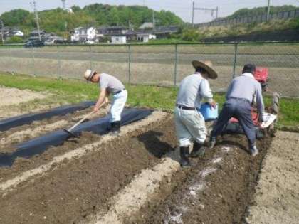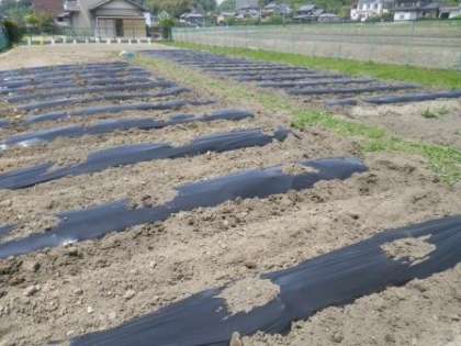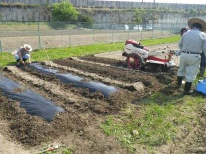 学校北側の学校園に、夏野菜を育てる準備が整ってきました。今日は朝早くから3人の「野菜名人さん」が来てくださり、耕うん機と手作業で畝を作り、肥料を施してくれました。一畝ごとにマルチシートをかぶせてくださり、後は苗植えをするだけのところまで準備を整えてくださいました。近々、苗植えをします。