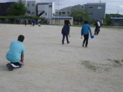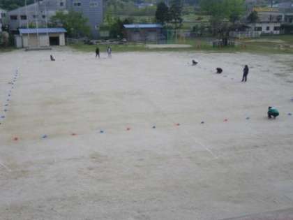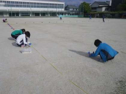 児童下校後の運動場では・・・ 〜運動会に向けて、ポイント打ち〜