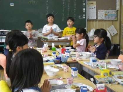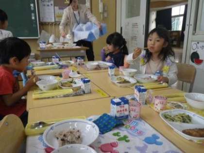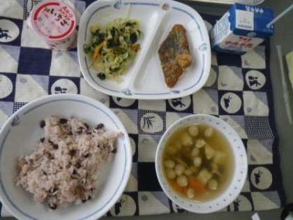 昨日の給食の話ですが、昨日は「入学進級お祝い献立」の日でした。赤飯とデザートにいちごヨーグルトが付きました。1年生は、小学校の給食にずいぶん慣れてきたようで、準備も早くなりました。いつも、ゆっくり時間をかけて食べています。1枚目の写真は、私(校長)の給食です。1年生は、これよりやや少なめの量です。