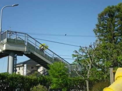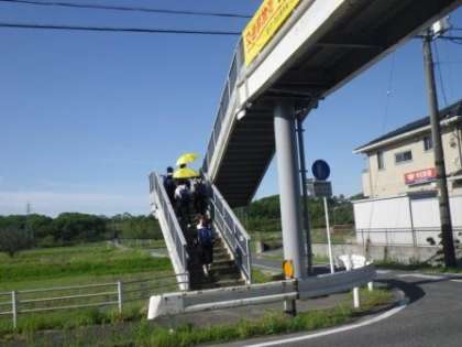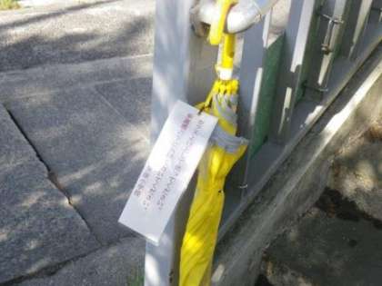 学校南にある歩道橋の近くの杉の木に、毎年、カラスが巣を作ります。4月〜5月上旬のヒナが巣立つまでのこの時期、巣を守るためにカラスの動きが攻撃的になります。小学生は集団で登下校するため、あまり危険な目には遭いませんが、中学生は一人で歩道橋を渡ることも多く、被害を受けることが時々あります。昨年は、お金をかけて業者に巣の撤去を依頼し、カラスが寄りつかないような薬剤塗布も行ってもらいましたが、今年もやはり巣を作りました。今年は、「黄色い傘」を用意しました。中学生は早速使ってくれています。この傘をさして歩道橋を渡ると、カラスも襲ってきません。しかし、ずる賢さでは人間の上をいくカラス。油断はできません。