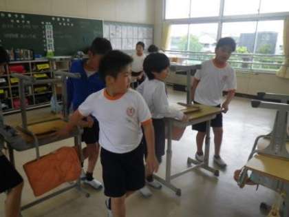 一生懸命に掃除に取り組んでくれる子が多い中、清掃中のケガが相次ぎ、関係の保護者の方にはご心配をおかけし、申し訳ございません。重い物を運んだり、机を移動させたりする時に起こりがちですので、十分に注意をしながら見守っていきます。今日は早速、二人で声をかけ合いながら、机を運んでいる姿を見かけました。