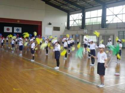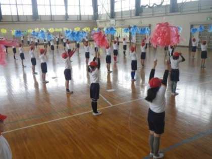 4時間目は、高学年が練習していました。今年9月で引退する安室奈美恵さんの名曲「Hero」に合わせ、ポンポンの付いたトーチ棒を息をそろえ、回していました。トーチワークの技術だけでなく、動き始めのタイミングや静止のタイミングなど、神経を集中させる必要があり、緊張感のある練習風景でした。難しい分だけ、完成すると見ごたえがあるはずです。お楽しみに。