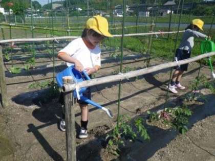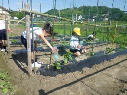 1・2年生が生活科の授業の中で、「野菜名人さん」の手ほどきを受けて植え付けた夏野菜。3年生が理科の授業で種まきをしたホウセンカ。ここのところの恵みの雨で順調に生長しています。今朝は久しぶりに青空が広がる中、子どもたちが水やりに足を運んでいました。キュウリの小さな花とその下にある赤ちゃんキュウリを見つけ、喜んでいる1年生の姿もありました。