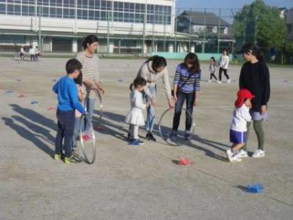 夕方の運動場。地域の方の練習が盛り上がってきました 〜「タガ回し」の特訓〜