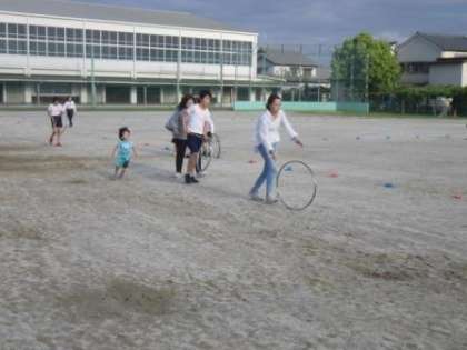 本校の特色ある行事の一つが、地域と合同で行う大運動会です。いよいよ1週間後に迫ってきました。老いも若きも男も女も、一堂に会しての祭典は楽しさもあれば、真剣さもあります。名物種目の一つである「地区対抗タガ回しリレー」は、コツをつかんでいないとなかなか上手くできません。学校の職員の勤務時間終了後である午後5時過ぎになると、運動場に地域の方々が集まってきて、熱の入った練習が行われています。本番を前にケガがないよう、気をつけて練習してください。