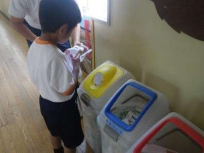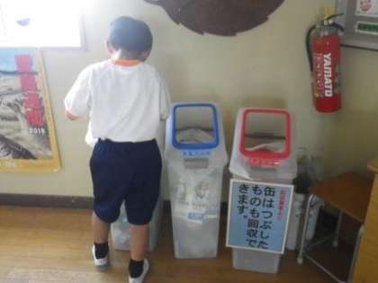 伊保小学校では、今年度も資源回収に力を入れていきます。PTA環境委員の活動では、今年も5回の学校公開日と、2度の個別懇談会の期間に回収を行います。品目は新聞紙、雑誌、雑紙、アルミ缶、牛乳パック、ダンボールです。また、児童の活動である福祉委員会の活動では、年間を通して、校内に設置した2か所の資源回収ボックスで、アルミ缶、牛乳パック、ペットボトルキャップ(エコキャップ)を回収しています。写真は、今朝、エコキャップを入れていた1年生の姿です。
