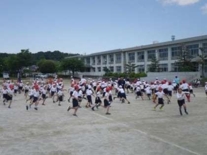 今日の2時間目は、全校男子(帽子取り・くす玉割り)と全校女子(綱引き)の種目練習を行いました。今日は、整列方法と入退場の仕方、種目の流れや動きを確認するだけで、実際に競技は行いませんでした。しかしながら、競技前のかけ声や、勝利チームの「バンザイ」などは大きな声でできました。入退場の音楽は放送委員会の児童が、本番と同じように流す練習をしました。
