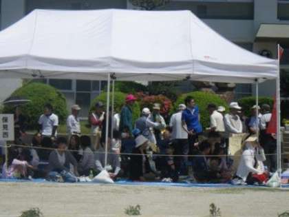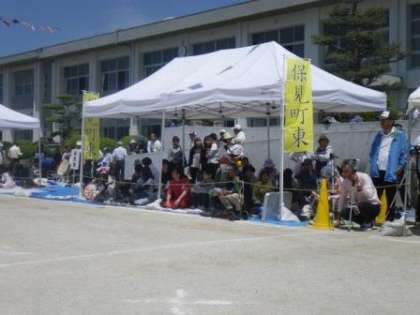 続いて、東保見町と保見町西、保見町東のテントです。保見町自治区は戸数が多いため、西と東に分かれて参加しています。伊保小地区運動会は5つの自治区が6つの地区に分かれ、親睦を図り、交流を深めました。ホームページを地域住民の皆様にも広く見ていただけるよう、保護者の皆様で呼びかけてくださると幸いです。