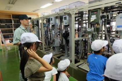 浄水場の建物内もていねいに案内していただきました。私たちのもとにきれいな水道水を届けるために、浄水場ではたくさんの機械で、川の水がきれいにされていることがわかりました。