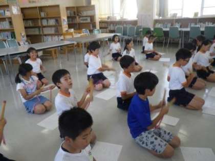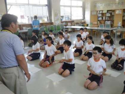 写真は、「御殿万歳」の練習風景です。東保見町の児童が中心になって活動しています。4年生が最後列に座り、前に座る上級生の背中を見ながら、動作を真似ていました。