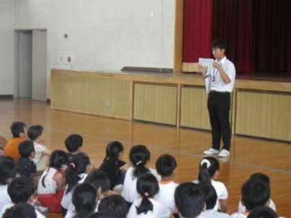 今朝は全校集会から一日が始まりました。4年生は公共施設見学の出発時間が早かったため、集会には参加しませんでした。始めに先週から実習を行っている教育実習生の先生の話を聞きました。その後は、美化委員会や6年生から、資源回収や「いぼリンピック」についての説明がありました。最後に生活担当の先生から、6月の生活目標についての話がありました。「すばやく あつまり だまって まつ」。伊保小の子どもたちの苦手とするところです。頑張って、取り組みましょう。