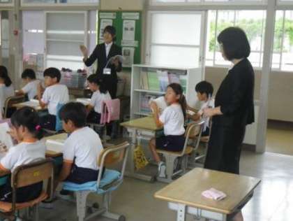 教育実習は今日から3週目に入りました。今日は実習生の通っている大学から、日頃、実習生が直接ご指導いただいている先生が来てくださいました。校長室で大学のお話をうかがったり、伊保小学校のことをお話しさせていただいたりした後、実習生の授業の様子を見ていただきました。4年2組の児童はいつも以上にはりきって、授業を受けていました。