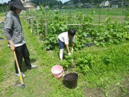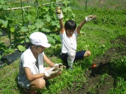 1・2時間目は、71学級の二人の児童が、担任の先生と一緒にジャガイモ掘りをしていました。「校長先生、イモ!」(私はイモではない!)と収穫したジャガイモを嬉しそうに見せてくれました。キュウリを獲ったり、ジャガイモを掘ったり、田植えをしたり・・・。都会の学校にはできないことですね。