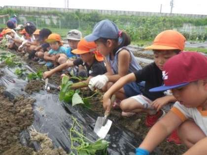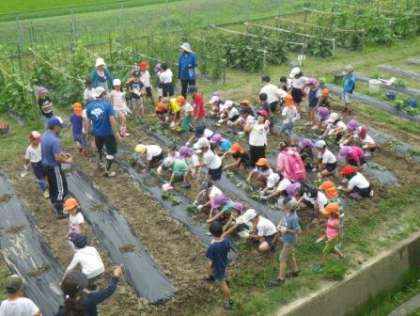 子どもたちは、1時間足らずで、用意されたすべての苗を植えました。今夜からは雨模様。きっと、植えられたばかりの苗には恵みの雨になることでしょう。秋には大きなイモができるはず。その時は、また園児と一緒に楽しくイモ掘りをしようね。