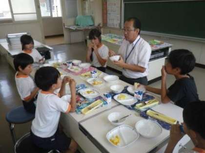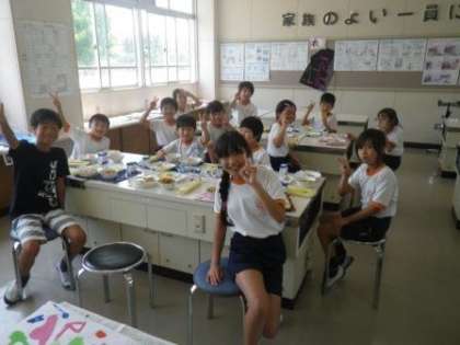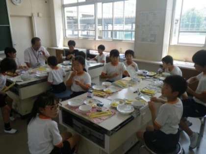 今日は、フレンド2−A班の13人と一緒に給食を食べました。フレンドランチでは、好きな給食をみんなに聞いていますが、今日の13人の中で人気のあった「焼きそば」と「米粉パン」が今日の献立でした。今日はだれも残さず、ほぼ時間どおりに片付けが終わりました。6年生と5年生が、最後の後片付けまで、しっかりやってくれました。