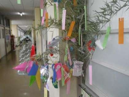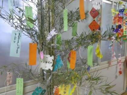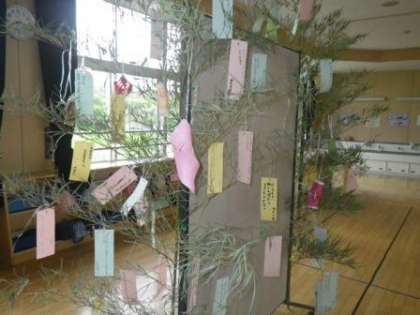 7月7日(土)は「七夕」です。天気予報では、しばらく雨が続くようで、星空になることは難しそうです。でも、子どもたちの願い事は天に届いてほしいものです。写真は1〜3年の笹飾りです。「にんじゃになれますように」(1年)、「じいじが天ごくで見守ってくれますように」、「妹ができますように」(2年)、「家ぞくがけんかなくしあわせにくらせますように」、「お母さんがやさしくなりますように」(3年) 何かこう伝わってくるものがある願い事ですね。