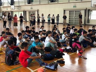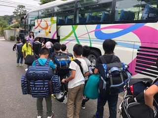 荷物をバスに積み込み、出発式を行い、六所山に向けて出発します。小雨ですが、何とかなるでしょう。