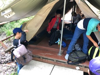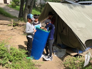 2泊したテントをきれいに掃除をしています。点検で合格しないと、何度もやり直しです。