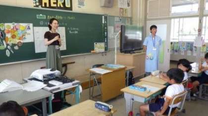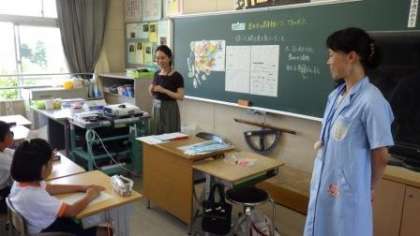 4年生は、昨日と今日の2日間、北部給食センターから栄養教諭の先生をお招きして、食に関する授業を行いました。担任と栄養教諭がティームティーチングで授業を進めました。今日は4年2組の教室で、「地産地食」をテーマに学習が進められました。給食には、地元豊田市産の食材がたくさん使われていることを、子どもたちは学びました。