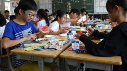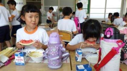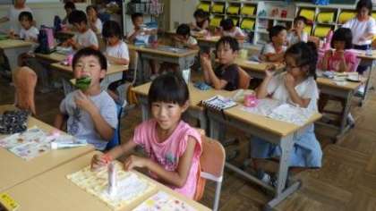今日の給食は、子どもたちが大好きなカレーライス。ハート型のカボチャコロッケも付きましたが、伊保小学校の給食にはスイカも付きました。学校の畑で、お店で買うのと変わらない甘いスイカができました。お腹いっぱいで一切れだけで済ませた子や、おかわりをした子もいました。今日の昼休みは、外遊びは控えて、身体を休めました。
