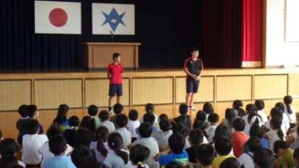 6年生が活躍しています 〜全校集会で、児童の前に立つ6年生〜
