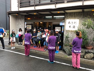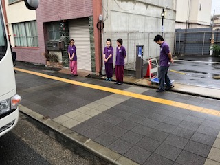 お世話になった旅館を出発しました。清水寺に向かいます。旅館の方がバスを見送ってくれました。