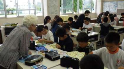 今日は5年生の家庭科の授業に、地域の手芸サークルの皆さんにご来校いただき、手縫い練習のお手伝いをしていただきました。「つむぎの会」の皆さんには、ここ数年、高学年の家庭科の授業に何度もお手伝いいただいています。おかげで、一人二人の教員ではとても手に負えない個別指導が充実し、子どもたちの技術が見る見る上達していきます。わずか80分間ほどの実習で、児童はいろいろな縫い方をマスターしていきました。