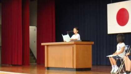 今日は前期の最後の日です。1時間目は体育館で学期区切り式を行いました。2年生、3年生、6年生の女子児童3名が、前期の反省と後期の目標について立派に意見発表を行ってくれました。全校児童の前で舞台の上から話すのは、とても勇気が必要なことですが、3人とも堂々と話ができました。たいへん素晴らしかったです。
