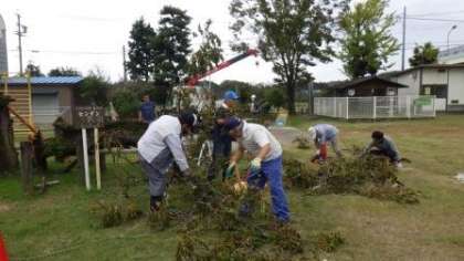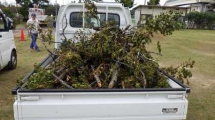 台風24号の被害を受けたセンダンの木が、業者さんや、地元神社の氏子総代の方々の手によって、細かくされ、射穂神社に運ばれました。お正月のお焚き上げなどに使っていただけるそうです。