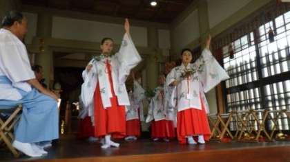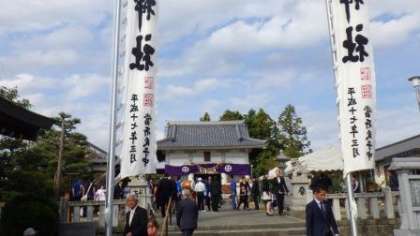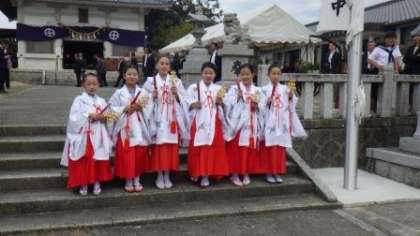 先週に引き続き、今週の土日も地域で秋祭りが行われます。今日の午後、4つめの自治区のお祭りに出席させていただきました。今日も巫女姿の女子児童に出会うことができました。代表の6年生児童が玉串奉奠(ほうてん)を行っていました。