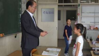 今日は、3年2組のきらりかがやき賞の表彰から一日が始まりました。5名の児童を表彰しました。学期区切り式で、全校児童を前に立派にスピーチを行った子、体育の授業の準備運動で大きな声で号令をかけた子、図書室でたくさん本を借りて、読書活動に熱心に取り組んだ子などを表彰しました。どの子も、しっかり返事をして、にこやかに賞状を受け取ってくれました。気持ちの良い朝のスタートでした。