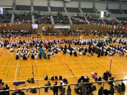 今日は豊田市総合体育館(スカイホール豊田)で、第46回豊田市小中学校特別支援学級・特別支援学校なかよし運動会が行われています。午前中、見学をさせていただきましたが、「みんな なかよく げんきよく」のテーマのもと、参加している児童生徒が、それぞれの力を精一杯発揮していました。会場からは温かい拍手や声援が飛び交い、心温まる場面の連続でした。他校の児童生徒も写っているので、会場全体の写真で雰囲気を感じてください。