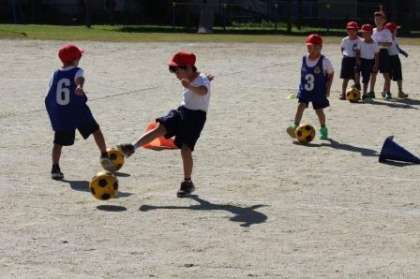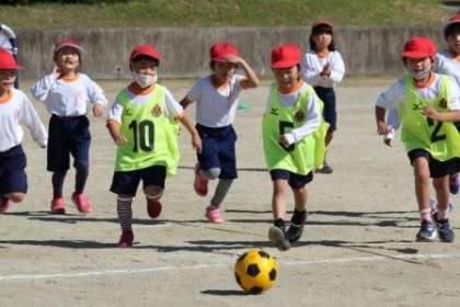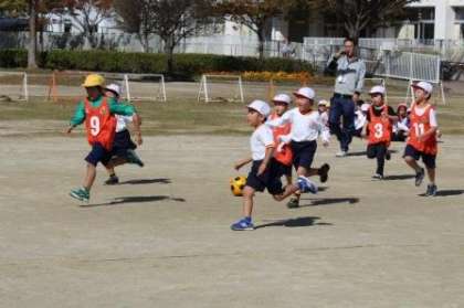 今日は名古屋グランパスエイトサッカースクールの指導者の方に来ていただき、ボールクリニックを1・2年生対象に行いました。サッカーの技術を向上させるためだけではなく、望ましい身体運動を体験したり、集団行動を学んだりするための学習として取り入れました。写真は2時間目に行った1年生の活動の様子です。