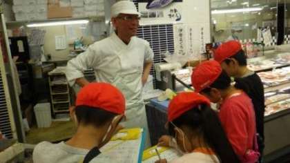 続いて、店内での調べ学習の様子です。営業中でお客さんが入っているにもかかわらず、店員さんは優しく質問に答えてくださいました。また、店内の様子や並べられている商品の写真なども、子どもたちの学習のため撮影を許可してくださいました。本当にありがたいことです。