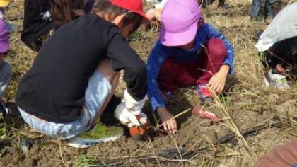2年生と園児が協力して芋掘りをしている様子です。来年は3年生と1年生の関係になります。2年生が少しだけ「お兄さん」「お姉さん」らしく見えました。