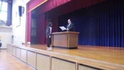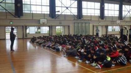 学芸会の代休明け、欠席者も少なく今週がスタートしました。1時間目の前に行った全校集会では、学芸会での頑張りをほめるとともに、次の目標の一つである持久走大会に向けて、体育主任の先生から練習に意欲的に取り組めるよう、モチベーションを上げる話がありました。また、夏休みの科学研究作品の優秀者に表彰も行いました。最後に生活指導担当の先生から、学校周辺にイノシシが出没している情報から、自らの身を守るポイントについて話がありました。皆様も夕方から夜間、早朝にかけてお気をつけください。