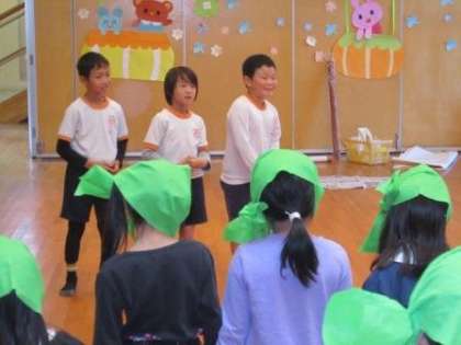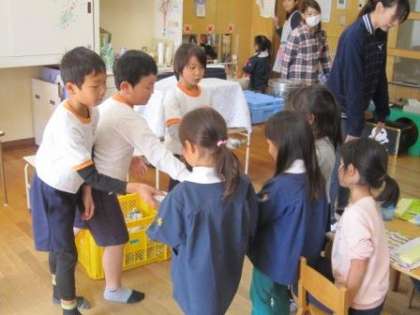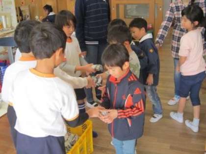 10月に一緒に芋掘りをした伊保こども園に、2年生の代表児童が焼き芋を届けに行きました。園児たちは「お兄さん」から手渡される焼き芋を、「わあ、温かい」と言いながら、嬉しそうに受け取っていました。