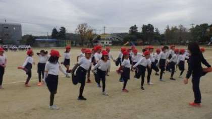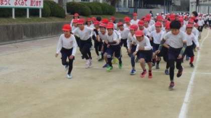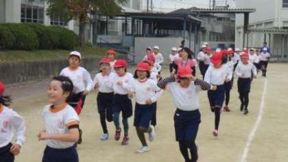 今日は朝からすっきりしない天気です。冷え込みは厳しくありませんでしたが、日差しがないため、肌寒い午前中です。雨が心配されましたが、今日も持久走練習を行うことができました。今日は4年生の様子です。準備体操をてきぱき行い、勢いよく走り始めました。4年生からは、トラックの外周を走り、練習します。