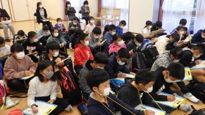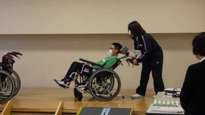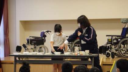 高齢者の皆さんとの交流を終えると、施設長さんや職員の方から、車椅子の種類や扱い方、高齢者の方が日常使っている食器の特色など、介護に関するほんの一部を教えていただきました。子どもたちはメモをとりながら、熱心に説明に耳を傾けていました。5年生は来週、高齢者擬似体験を行う予定です。