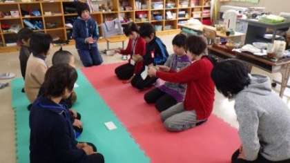 71組と72組は、1月の学校公開日で「お茶会」を開く計画を立てています。今日は、地域でお茶のサークル活動をされている方々を講師にお招きして、お茶の点(た)て方や出し方、いただき方などの作法を教えていただきました。初めての体験でしたので、動作の一つ一つを講師の方からていねいに教えていただきました。来週もう一度、練習の機会をもち、冬休み明けの最初の公開日で、お客様にお茶を召し上がっていただく予定です。